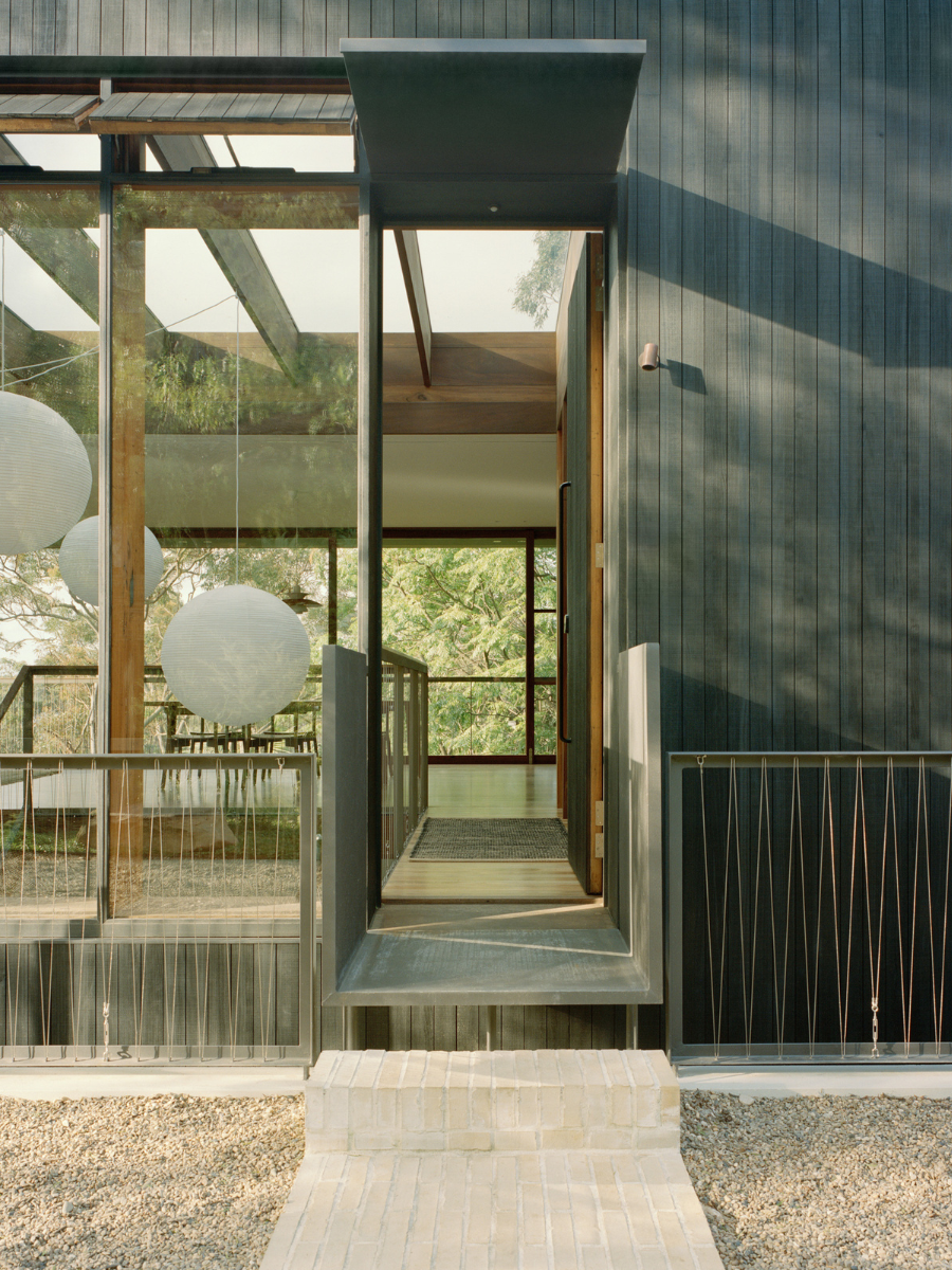 La paleta de colores surge directamente de los materiales utilizados. Predominan los tonos cálidos de la madera, los grises sobrios del concreto y los matices terrosos del ladrillo, mientras que el acero y las carpinterías metálicas añaden acentos más oscuros. El resultado es una casa que se mimetiza con el entorno natural y al mismo tiempo mantiene una identidad clara y elegante.