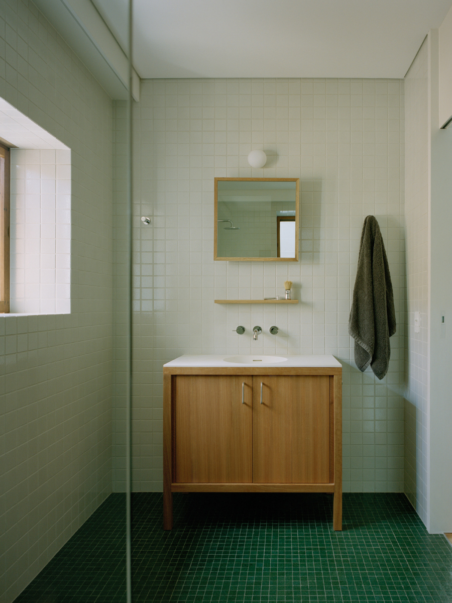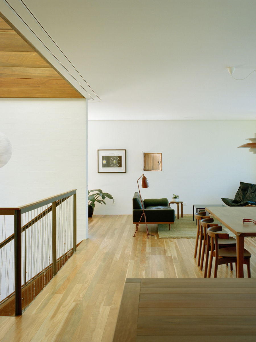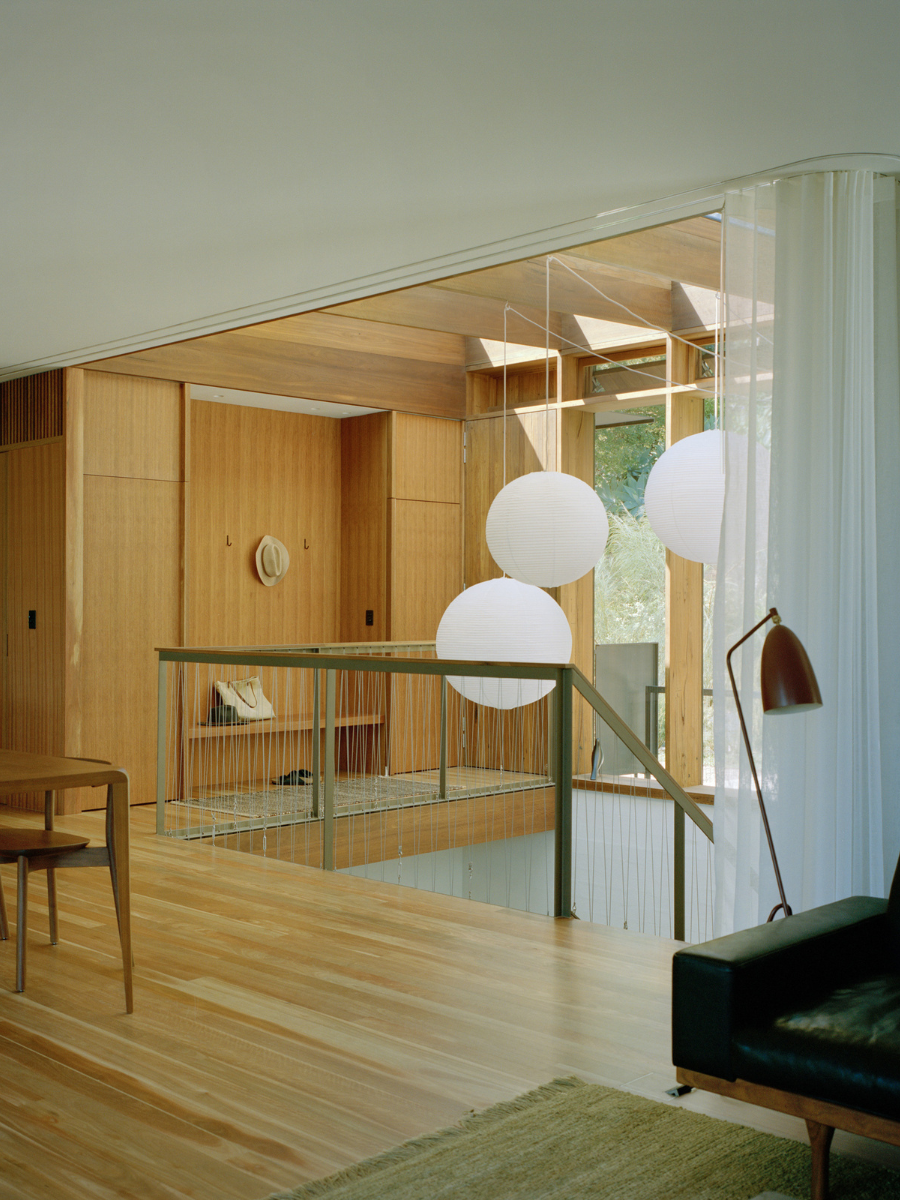 En el interior, la atmósfera se vuelve más serena gracias al uso de colores neutros y superficies claras que reflejan la luz natural. La madera sigue siendo protagonista, aportando calidez y continuidad visual. Uno de los gestos más significativos fue la apertura de un patio interior al retirar parte de la losa existente. Este espacio introduce vegetación y aire, mejora la ventilación y permite que la luz inunde los ambientes, creando una conexión constante entre interior y exterior.