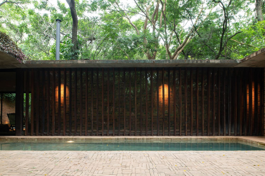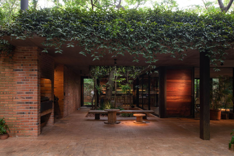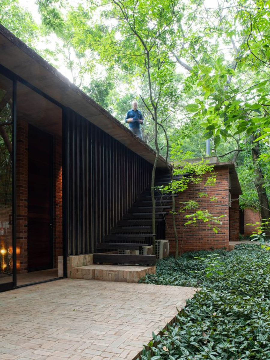 La paleta de colores surge directamente de los materiales utilizados. Predominan los tonos cálidos de la madera, los grises sobrios del concreto y los matices terrosos del ladrillo, mientras que el acero y las carpinterías metálicas añaden acentos más oscuros. El resultado es una casa que se mimetiza con el entorno natural y al mismo tiempo mantiene una identidad clara y elegante.
