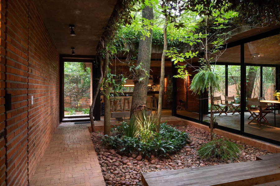 Lo interesante es que estos materiales no se usan para impresionar, sino para crear una arquitectura coherente y cercana. Cada textura y cada color dialogan con la naturaleza que rodea la casa, y eso se refleja también en el interior. Los espacios principales se abren hacia patios y ventanas que permiten la entrada de luz natural y ventilación cruzada. La cocina y la sala, por ejemplo, están separadas físicamente pero conectadas visualmente gracias a un patio intermedio. De esta manera, los ambientes son independientes pero nunca se pierde la sensación de estar juntos.