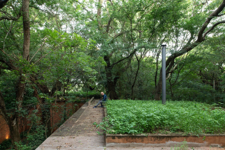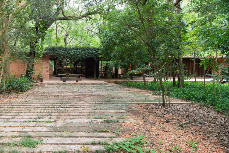 La cubierta, por su parte, se resuelve con una losa de concreto que sostiene una terraza-jardín. Este “techo vivo” cumple múltiples funciones: aporta aislamiento térmico, integra el volumen a la vegetación circundante y permite el cultivo de especies comestibles. Así, el techo no es solo un cierre, sino una extensión del suelo: un plano fértil, cargado de significado ecológico.