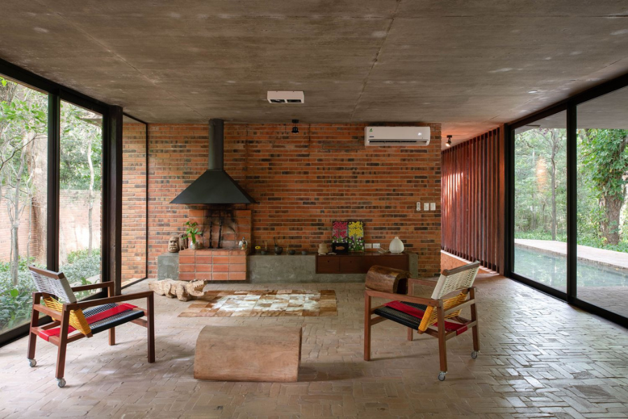 El proyecto parte de una premisa clara: construir con lo disponible. Desde esa lógica, la selección de materiales no responde a una búsqueda estética forzada, sino a una coherencia con el contexto inmediato. El ladrillo artesanal, por ejemplo, es protagonista no solo por su calidez y textura, sino por su capacidad de generar masa térmica, regular la temperatura interior y envejecer con dignidad.