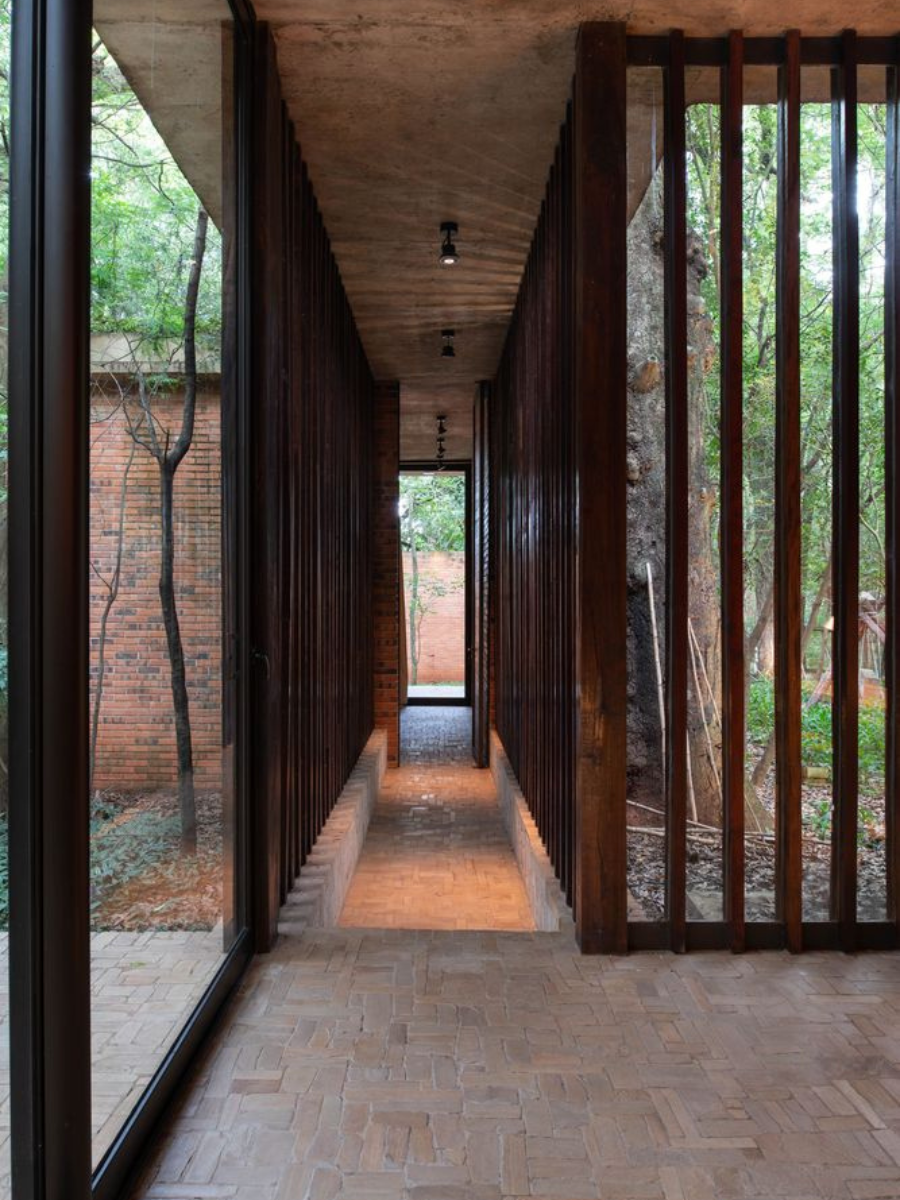 La madera también tiene presencia, aunque de manera más puntual, en carpinterías y elementos estructurales secundarios. Se trata de piezas recuperadas, que aportan calidez y establecen una sutil tensión con el peso del ladrillo y el concreto. No hay lugar para la ostentación; todo responde a una lógica de reutilización, durabilidad y bajo mantenimiento.