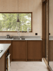 La elección de materiales en Roost se rige por tres principios clave: resiliencia, bajo impacto ambiental y estética integrada al entorno. Los arquitectos optaron por maderas como el ipe y el abeto Douglas, ambas reconocidas por su durabilidad al intemperie y su resistencia estructural. Estas especies no solo permiten una larga vida útil sin necesidad de acabados tóxicos, sino que además adquieren una pátina natural con el tiempo, ayudando a que la estructura se funda visualmente con el entorno.