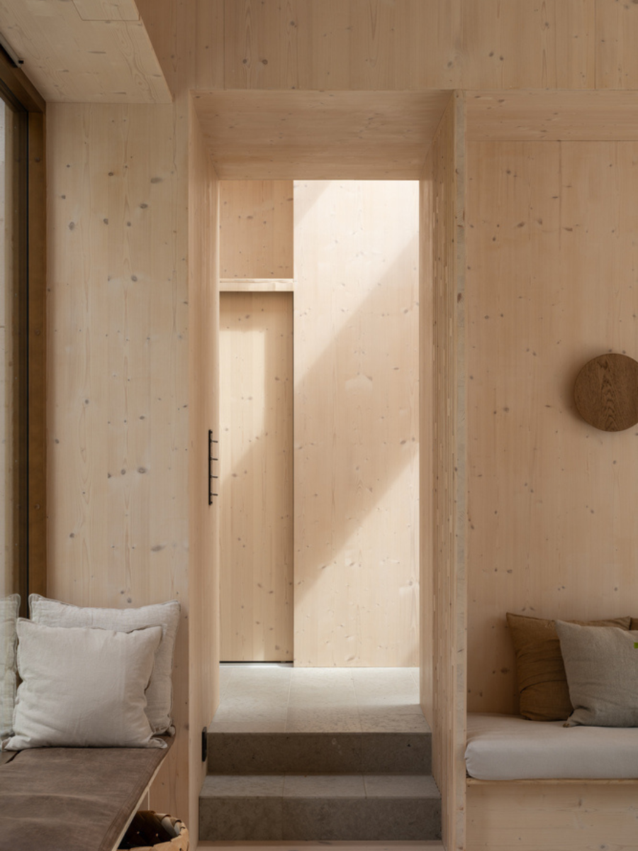En el interior, el ambiente es sereno y táctil. Las superficies de madera clara, la suave piedra caliza gris y los refinados detalles permiten que la luz se mueva libremente por los espacios, al tiempo que mantienen un estrecho diálogo con la naturaleza. El cuarto de baño, completamente revestido de piedra, se convierte en un santuario privado con su banco empotrado y su ducha de efecto lluvia.