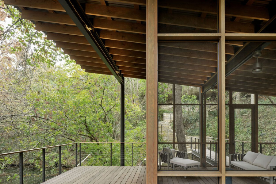 La elección de materiales en Roost se rige por tres principios clave: resiliencia, bajo impacto ambiental y estética integrada al entorno. Los arquitectos optaron por maderas como el ipe y el abeto Douglas, ambas reconocidas por su durabilidad al intemperie y su resistencia estructural. Estas especies no solo permiten una larga vida útil sin necesidad de acabados tóxicos, sino que además adquieren una pátina natural con el tiempo, ayudando a que la estructura se funda visualmente con el entorno.